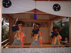 | 天の神様方は、伊邪那伎(いざなぎ)、伊邪那美(いざなみ)男女二柱の神に、『この漂っている国を整えて、しっかりと造り固めよ』と仰せられ、立派な矛をお授けになりました。 そこで、伊邪那伎(いざなぎ)の命が下界をかき回し、その矛を上げると先から落ちたしづくが、淤能碁呂島(おのころじま)と言う、日本で最初の島になったと言う神話に基づいた舞と言われています。 |